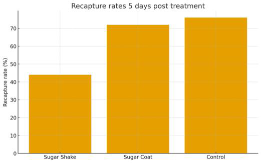 The authors conducted a rigorous mark, release, and recapture experiment that spanned colonies in Alabama, Tennessee, and Pennsylvania. In each colony, 900 worker bees were collected from brood frames using standard Varroa monitoring techniques. These bees were immobilized on ice, individually marked with paint on the thorax, and assigned to one of three groups, the powdered sugar shake group, the powdered sugar coat group, and a control group. The powdered sugar coat group served as an important additional control, because it allowed the authors to determine whether the sugar itself, without shaking, contributed to mortality. Each group contained 300 marked bees. The powdered sugar shake group received two tablespoons of powdered sugar through the screened lid of a jar, and the jar was rolled gently until bees were completely coated. After resting for two minutes, the jar was inverted and shaken vigorously for one full minute, a standard sugar shake procedure used by beekeepers worldwide. The powdered sugar coat group received the same sugar coating but was not shaken. The control bees were marked and released directly.