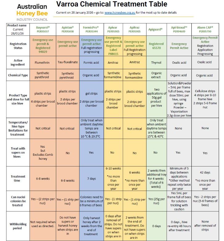 You can get completed details at the AHIBC website where you can access an up-to-date Varroa Chemical Treatment Table